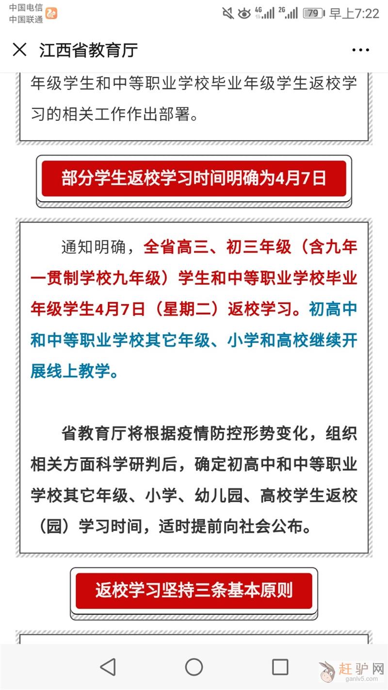 通知明确,全省高三、初三年级(含九年一贯制学校九年级)学生和中等职业学校毕业年级学生4月7日(星期二)返校学习。初高中和中等职业学校其它年级、小学和高校继续开展线上教学。来源www.ganlv5.com